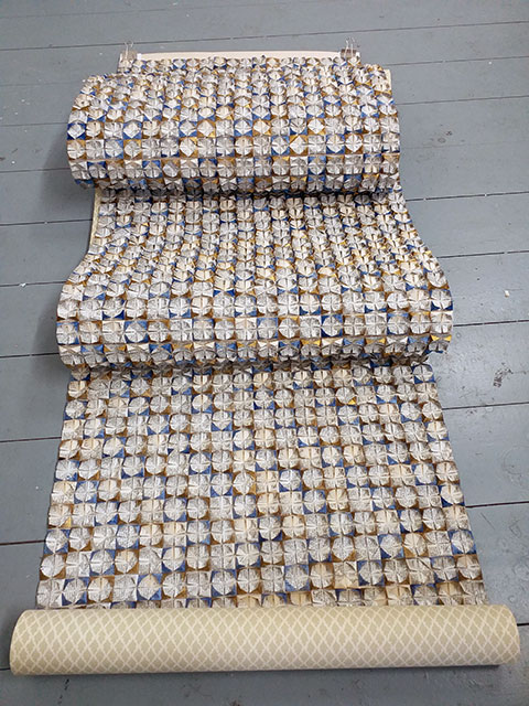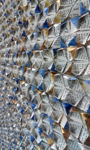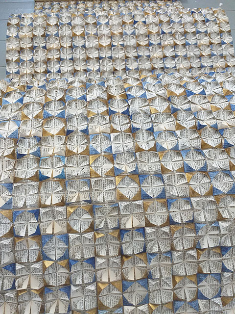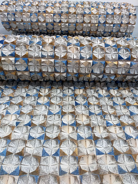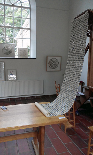 An invited interactive residency, part of 'Kunstspoor' Art Festival. Over the course of a week, visitors to the Church watched The Old Testament of the English Bible being folded and 'woven' into an intricate herringbone pattern on a roll or 'cloth', which fell from the pulpit. The work was finally finished in 2020 and displayed at SoShiro House in Marylebone by JaggedArt.