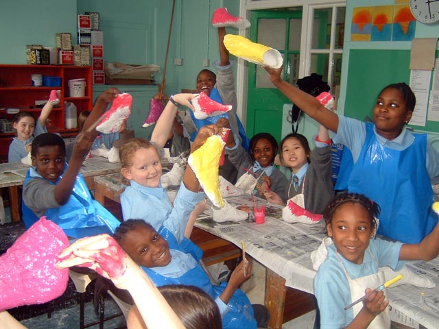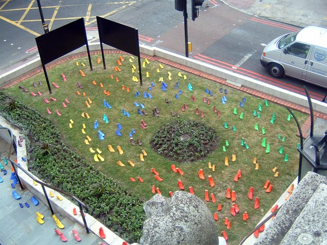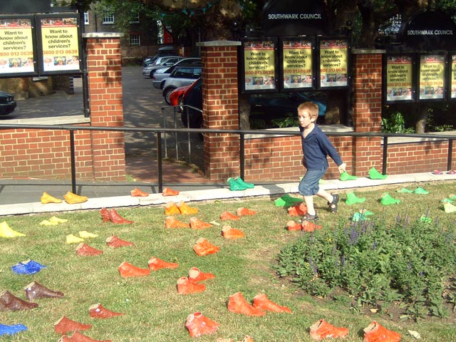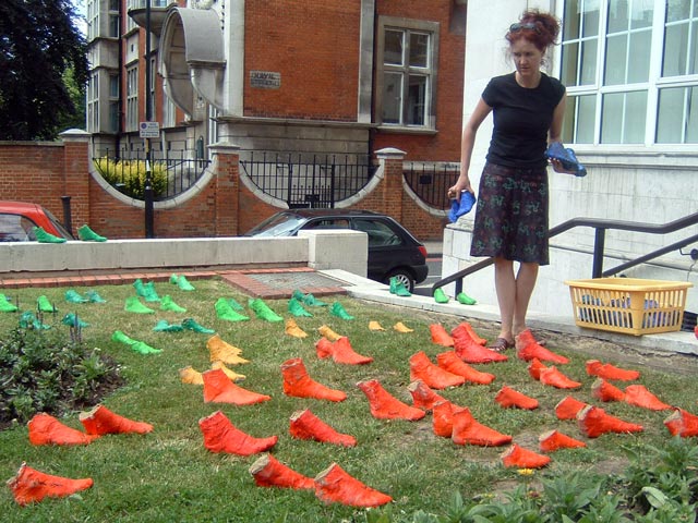 Project funded by Camberwell Arts. Moulds of children’s feet collected from all over the borough and installed for Camberwell Arts Week. The many coloured pairs of feet ‘marched’ up the left side of the Town hall and then down again the right side, referencing the Pied Piper of Hamlyn and the vast creative resource that lies in the next generation.