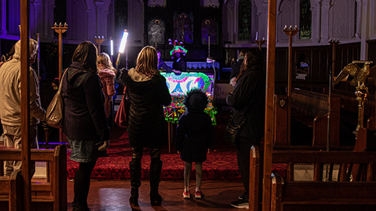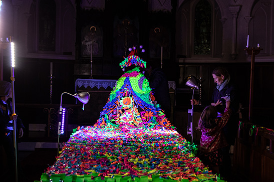 An interactive project for Strange Cargo's Winter Light Festival. Inspired by a Chinese fairytale promoting good craftsmanship and attention to detail. Over the course of 2 nights, participants filed through the church adding loops of neon 'stitches' to a cloak. At the end of the festival, a 'goddess' was selected to wear the cloak and parade down the street with her attendants in celebration of the work created together.