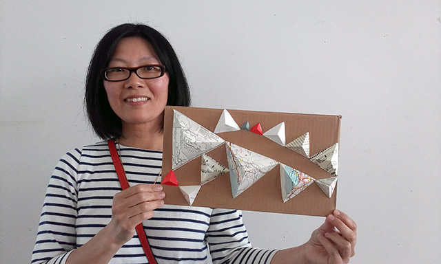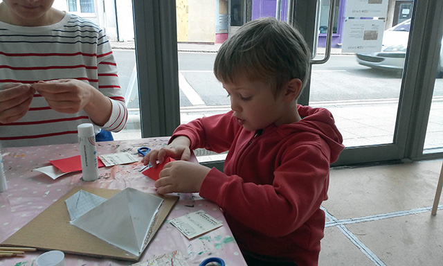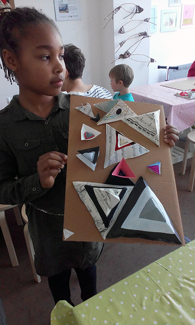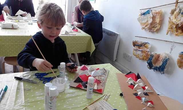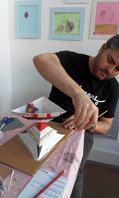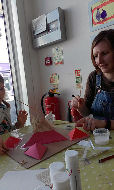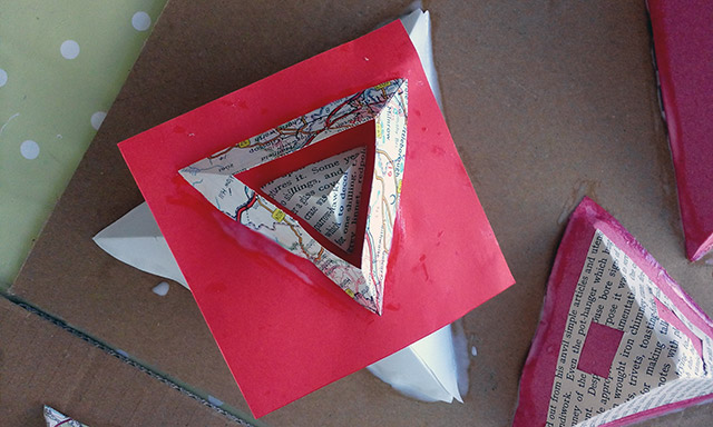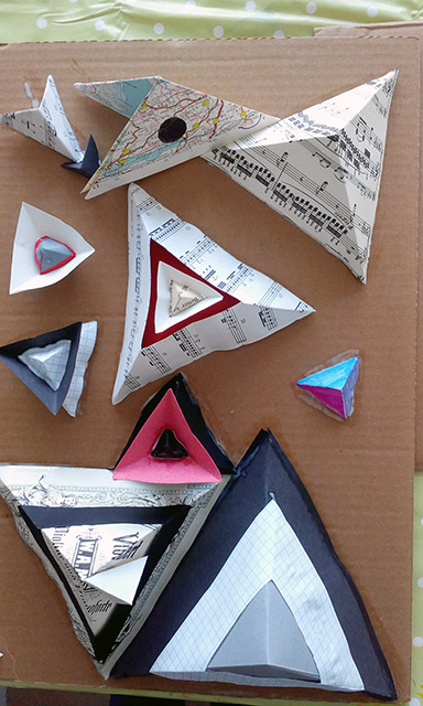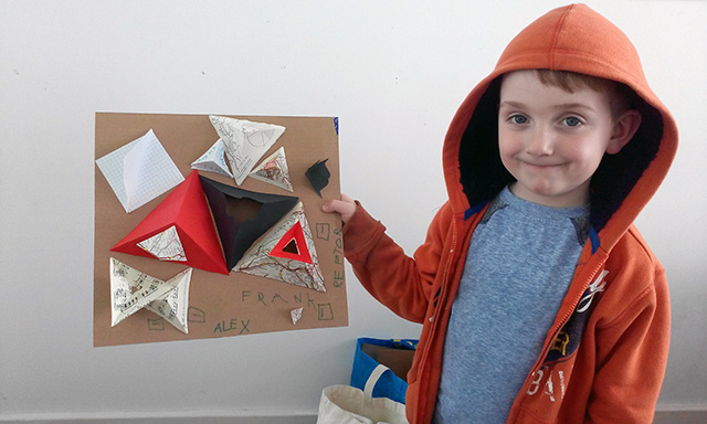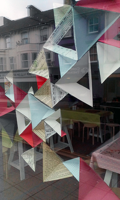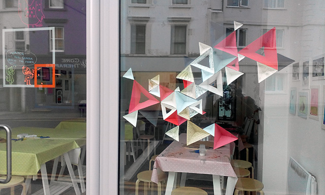 Commissioned by The Creative Foundation in Folkestone, a family drop-in workshop, building on cardboard bases with a limited colour pallet. The pyramids grew off the cardboard and across the windows of Block 67.