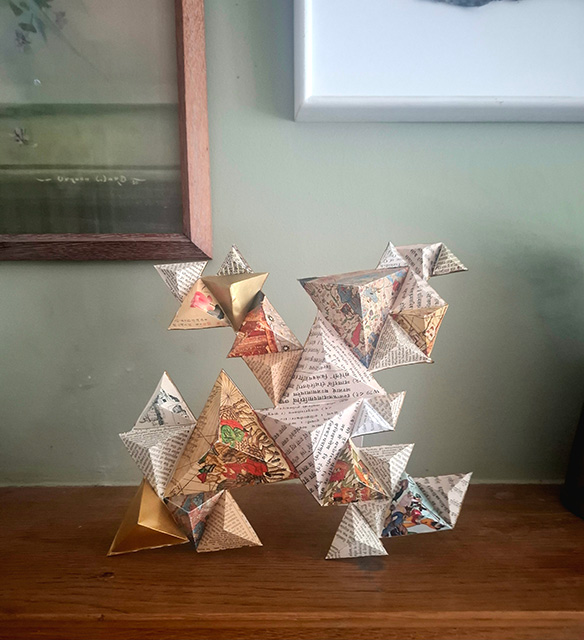Born from the oddments and treasured snippets of text scattered around my studio, these tiny paper pyramids grew into a family of one-of-a-kind sculptures. Perched on mountboard and made at joyful speed, each piece had its own little personality. They were created as quirky gifts and pocket-sized artworks—mini 3D collage worlds ready to live on a wall, a fridge, or wherever they chose to land.